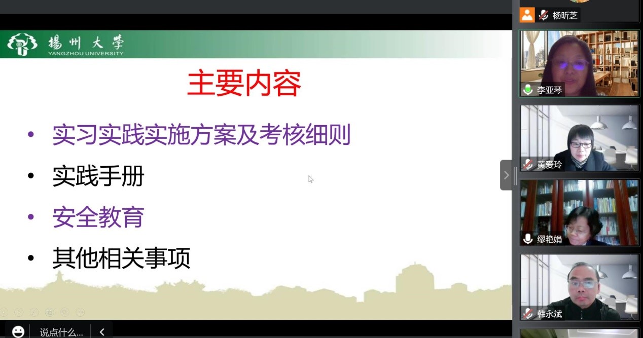 首先,缪艳娟主任强调,实习实践这一环节对会计专业硕士培养是至关重要的,高质量的实习实践是培养高素质会计人才的重要保证。其次,两位班主任韩永斌老师和黄爱玲老师分别发表讲话。他们指出,实习实践是会计专业硕士人才培养理论联系实际的重要纽带,是培养会计应用型人才培养的必经之路,督促学员们务必重视实习实践这一环节。最后,中心对实习实践工作进行了总动员,向学员们介绍和解读了《扬州大学专业学位研究生会计硕士专业学位实习实践实施方案》《扬州大学商学院会计专业学位研究生专业实践与考核管理细则》《实践手册》及安全教育等事项。