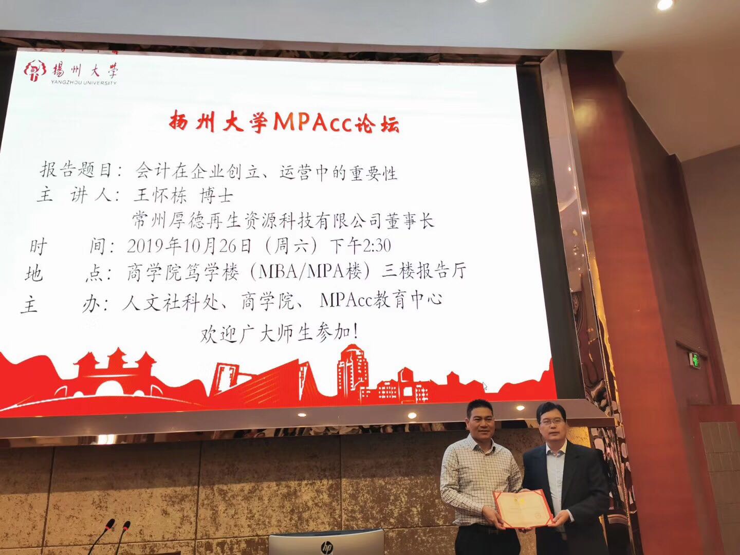 2019年10月26日下午,常州厚德再生资源科技有限公司董事长王怀栋博士应邀来到扬州大学商学院,为MPAcc师生作了题为《会计在企业创立、运营中的重要性》的专题报告,扬州大学MPAcc中心副主任缪艳娟教授主持了报告会。